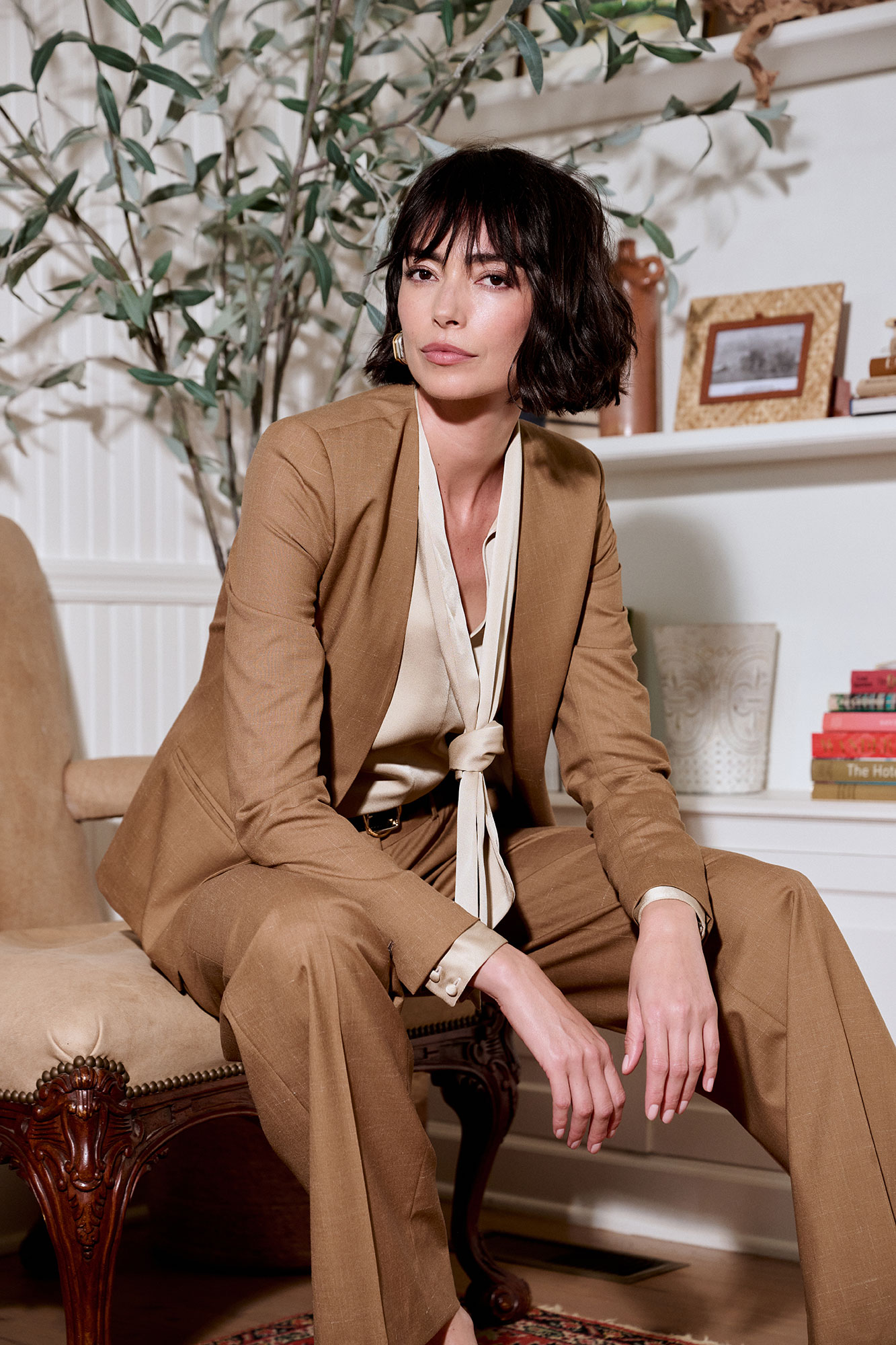This russet suit blends relaxed tailoring with refined sophistication. The Becca jacket features a collarless, open-front design for effortless layering, while the Wanda trousers offer a mid-rise, wide-leg fit. Crafted from a wool, silk, and linen blend, the ensemble balances polished style with comfort.