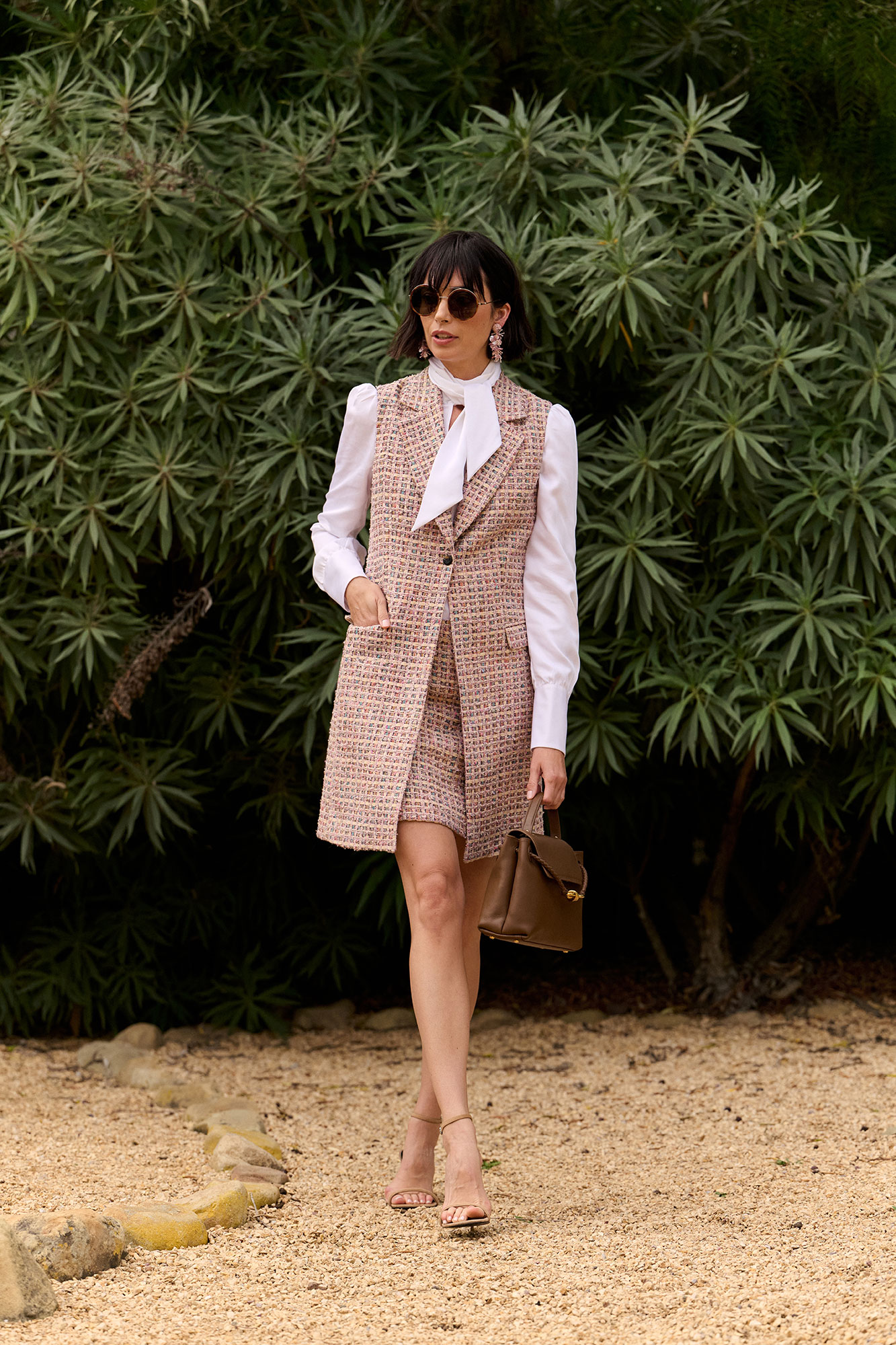 This Irina tweed set exudes classic elegance with a modern touch. The sleeveless jacket features marble buttons and a refined jacquard texture, while the matching skirt offers a tailored, flattering silhouette. Crafted from luxurious fancy tweed, the ensemble combines sophistication with timeless style.